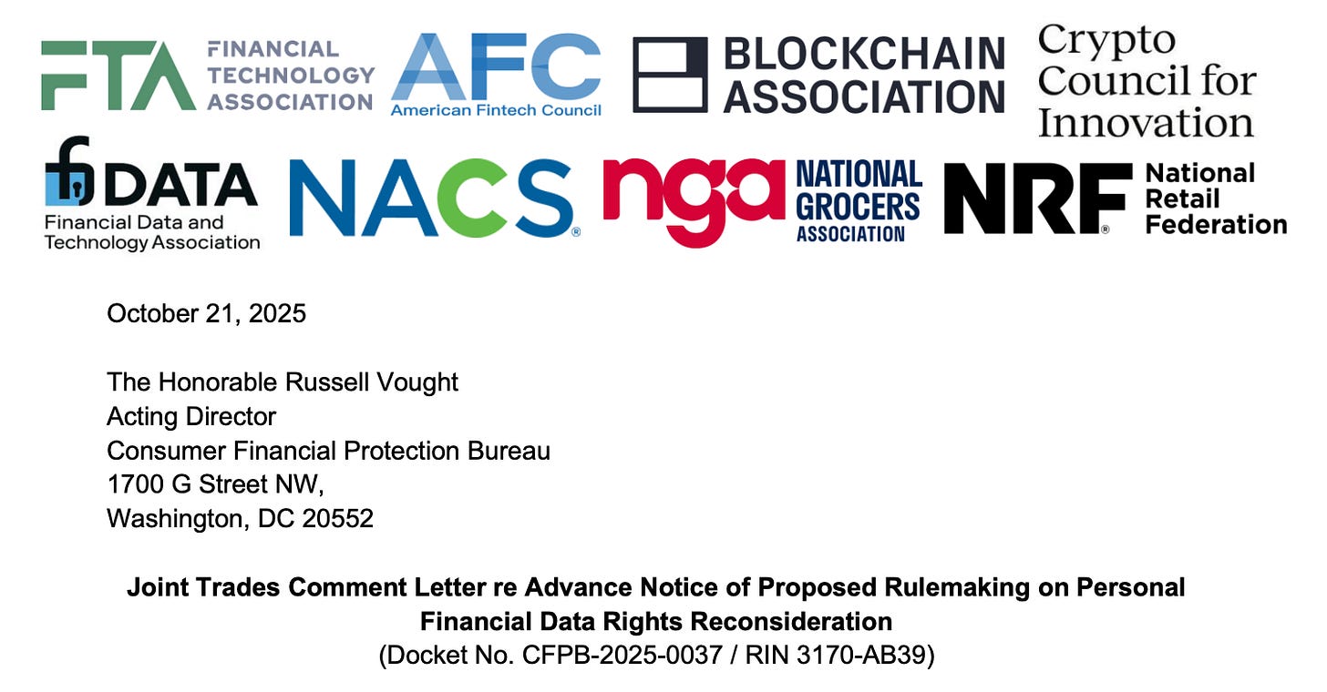 The Financial Technology Association, the trade group that took up the mantle defending the existing open banking rule after the CFPB, under acting director Vought’s leadership, switched sides to join the Bank Policy Institute in asking for the rule to be vacated, was joined by other financial, crypto, and retail associations in submitting a comment letter regarding the proposed do over.