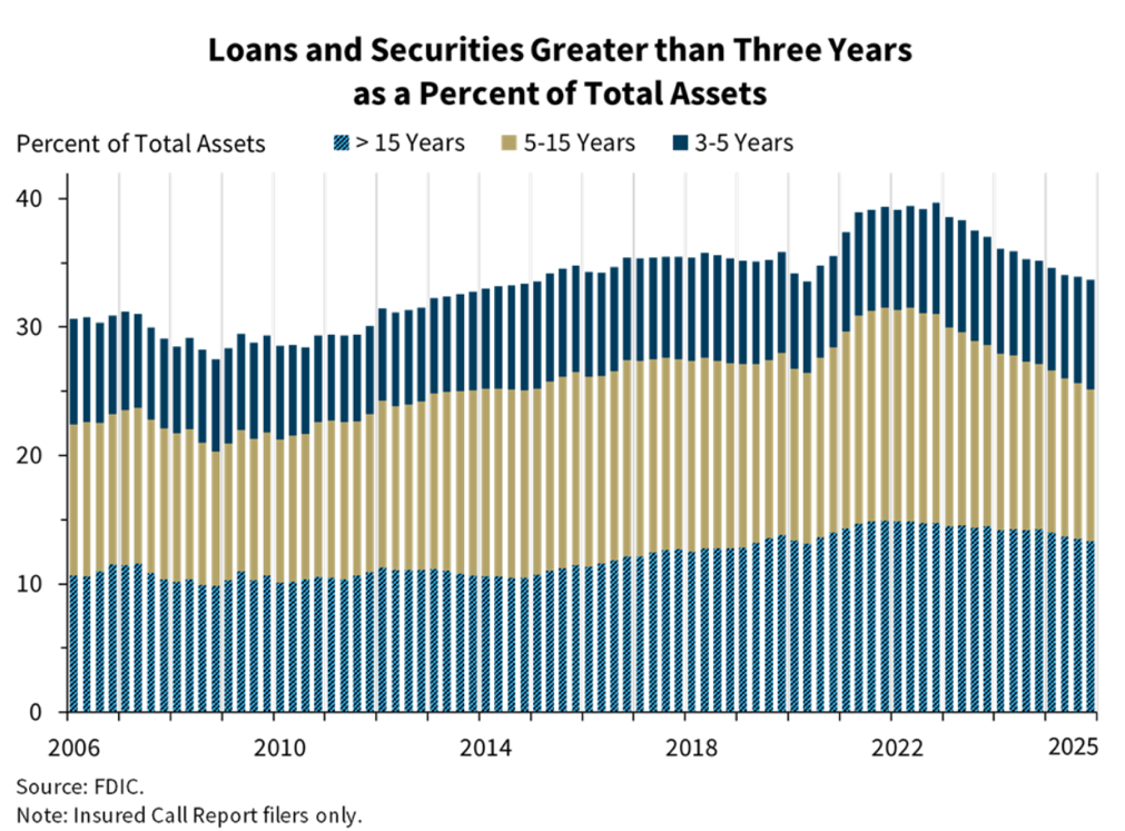 The FDIC also tracks the share of longer-term assets to total assets at banks, the percentage of which has fallen 12 quarters in a row and totaled 33.7% in the fourth quarter. This is the lowest level since 2020, and down from the peak of 39.7% three years prior. Longer-term assets still make up a larger share of community banksâ total assets: 42.9% at the end of 2025.
