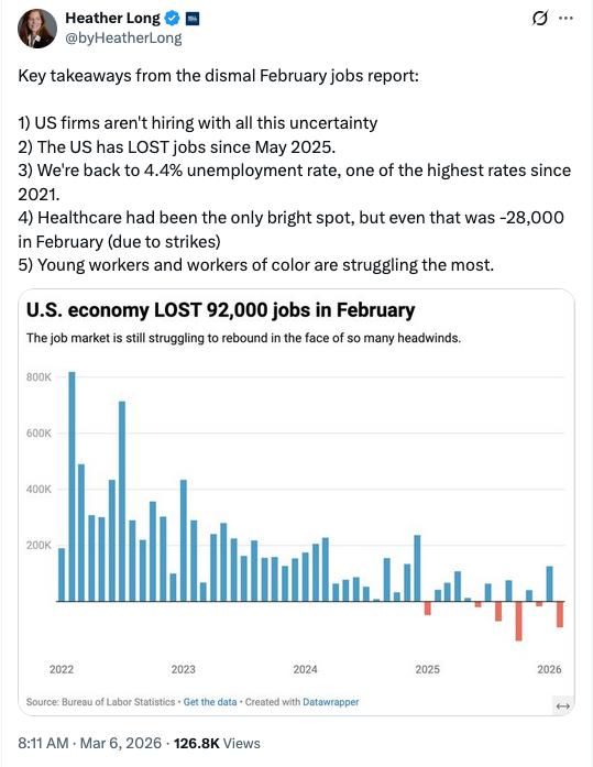 The unemployment rate hit 4.4% in February. Heather Long, chief economist at Navy Federal Credit Union, called the February jobs report âdismalâ on Twitter and pointed out that the âUS economy has LOST jobs since April 2025. Total job gains since May 2025 to February 2026 are now -19,000.â Long joined Bank Nerd Corner this quarter to discuss labor trends, including the K-shaped recovery.